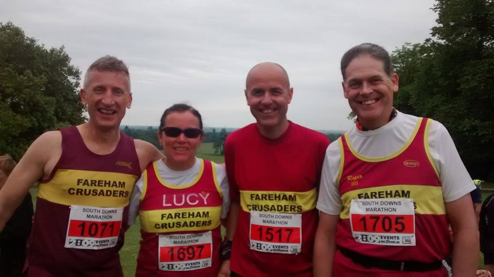 My alarm clock went off at 5.30 am and the start of a long and enjoyable day was made that much better with overcast skies and cooler temperatures, than of late. Paul Coates, Dave Fuller, Lucy Peazold and myself were soon on route to Queen Elizabeth Country park, which was to double up as both the car park and marathon finish. The first item on our agenda was to catch a bus to the start at Slindon College, so off we went with our fellow runners, “All aboard the marathon bus !!”
