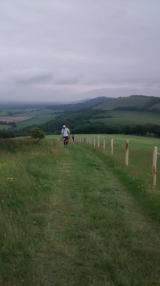 As we left the grounds of Slindon College Paul quickly disappeared into the distance while the 3 of us got into our stride along some narrow lanes that then started to gradually climb from a mile or so in and with only the exception of a short flat section the gradual climb carried on until mile four. It’s not too often that you see people walking in the first 3 or 4 miles but with 3,300 feet of climbing in total the tactics of, when to walk and when to run, would come into play. I ran most of the first 4 miles and was pleased to reach Glatting Beacon at 5 and the first drinks station.