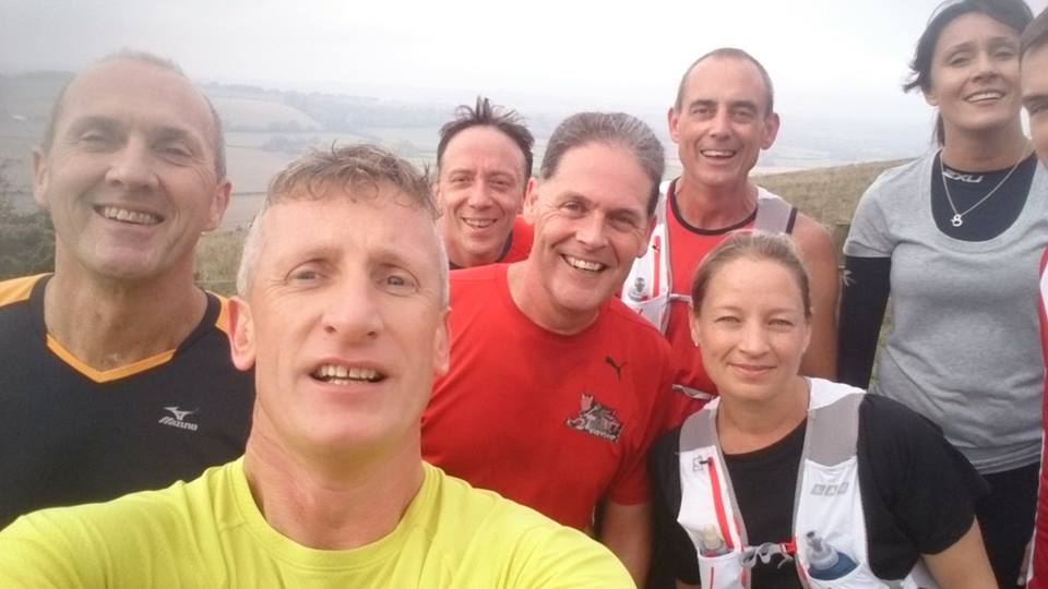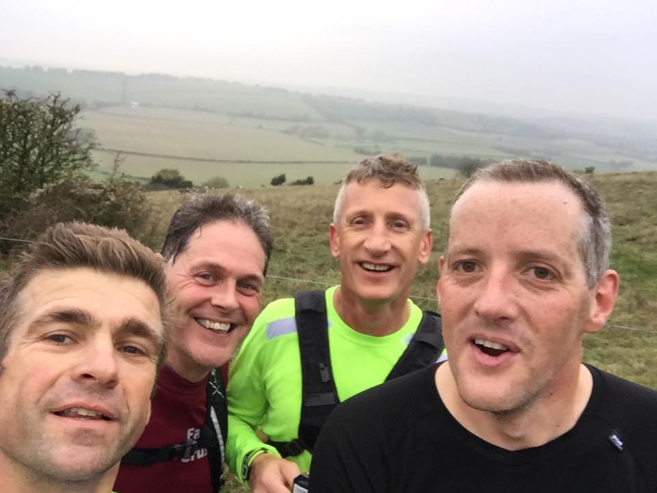After retracing our run back to the railway line we approached the lower slopes of Old Winchester Hill with its mud that’s been churned up by the rain and MTB riders, so it needed some balanced “4 wheel drive type” running. As we ran around the base of the main hill the steepest climb of the day awaited us. I was thankful to reach the top and all four of us agreed our legs were being tested. A quick selfie later (Paul is the George Clooney look alike) and we were off admiring the countryside views on route to this hills trig point. The descent also had tree roots as an added challenge to go with the mud.