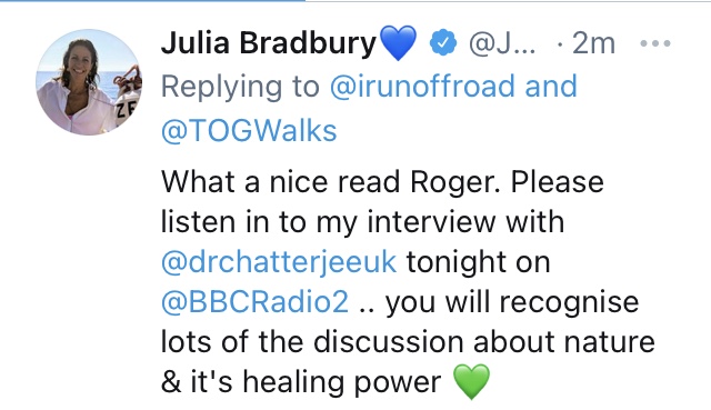 Inspirational presenter Julia Bradbury recently asked the question “What is it about being outdoors ?” on her Cornwall and Devon Walking program. “It makes my heart sing” was the answer and Julia acknowledged a kindred spirit. I’m keen to try and describe what it means to me, not necessarily from a running point of view but more from a life long appreciation.